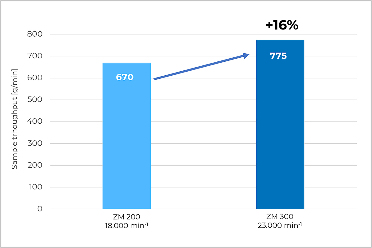 O rendimento máximo da amostra, por ex. ao triturar ração de frango com crivo de 0,5 mm, pode ser aumentada em 16% ao triturar na velocidade máxima de 23.000 min-1 em vez de 18.000 min-1.